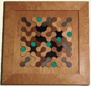 The ten curvaceous shapes of 1 through 4 "rounds" and "bridges" are styled with three tones of wood and your choice of three colors of transparent acrylics, in a broad scalloped border. (See their basic format in the "Essential Polyforms" section.) Reversible 12½" maple-framed tray has a felt-lined play surface. A separate 8½" game grid is included. A clear cover plate makes it ready to hang on the wall or set on its easel. It looks especially effective when placed diagonally. |