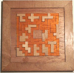 The 36 hexominoes have twelve special pieces singled out by contrasting wood/acrylic. (See their basic format in the "Polyominoes" section.) Felt-backed 12½" maple-framed tray with clear cover plate is ready for play or display. The tray's flip-side is also a play surface. Game grid and easel included. Please indicate your preferred choice of transparent color to accompany the wood pieces. |