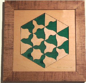 A hexagon of alternating wood and tinted transparent acrylic tiles evokes a flock of birds in flight. Kate Jones' 24 graceful triangles are actually every permutation of four differently shaped edges. (See their basic format in the "Edgematching" section.) Felt-backed 12½" maple-framed tray with clear cover plate is ready to hang or set on its easel. Easel included. Please indicate your preferred choice of transparent color to accompany the wood pieces. |