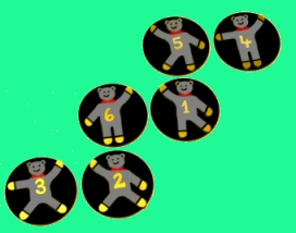 Above left: There are 5 rows of 2 bears each, counting horizontal and vertical. Add the numbers of each pair, and you get 5 different sums that are also consecutive: 5, 6, 7, 8 and 9. This is just one of dozens of "magic square" types of number puzzles in the Six Disks booklet. Above right: A circle of bears numbered 1 through 6. Can you rearrange the numbers so that no pair of neighboring bears in the circle has the same sum as any other pair? The arrangement above has two pairs that add to 7. Happy puzzling! And be sure to challenge a child you know with this charmingly educational set! |