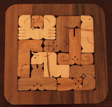 Here is a whimsical version of Ten-Yen where each piece resembles an animal, done in 3 kinds of wood. This finely handcrafted work of art is by Dan Klarskov, a puzzle lover and woodworker from Denmark. See more of Dan's puzzles on his website.