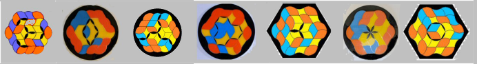 THE CRAB (Le Crabe)TM ...created by Jacques Ferroul The 27 tiles are transformations of a diamond into combinations of straight, convex, and concave sides. Though each piece has a unique shape, the set can be coaxed into finding the right neighbors to fill the desired space. With thousands of combinations possible (see samples below), the set lends itself to your most beautiful artistic creations. Jacques defined the colors by the pieces that are larger, smaller, or equal in area to the original diamond. The solution at left is rare: no two of the same color share sides. A strategy game is included, "Color Reefs", reminiscent of crabs' favorite hangout, coral reefs. Lasercut acrylic in 9" hexagonal tray with star grid, 18 lens-shaped black fillers, and a 12-page activities booklet. For 1 or 2 players, ages 8 to adult.