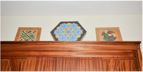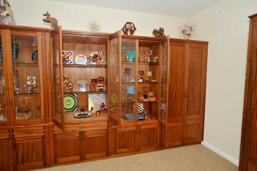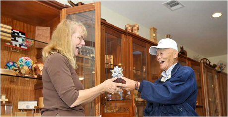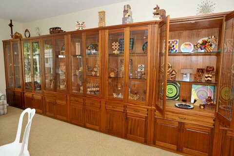 Marti had a wall of wooden cabinets custom-built to house her extensive collection in a museum-like setting. Notice our puzzles adding a colorful touch throughout. It makes us feel very good to know how much our designs are appreciated and what a fine home they have in Marti's puzzle showcases. Marti has the world's most radiant smile. Here she shares puzzle delight with a visitor: