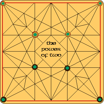 The goal of the game is to be the first player to bring all of one's pieces onto the board. Each player has 16 wood playing pieces which are blank on the bottom and have a felt pad on top. Four of them are placed, felt side up, on the board as shown at the beginning of the game. The other 12 await entry. The strongly symmetric network of angled lines on the board, laser-engraved on wood, creates 64 intersections, or "nodes." The players by turns move their pieces any distance along an unobstructed line to an unoccupied node. When the moving piece comes to rest on a node adjacent to a node occupied by either player, the second phase of the turn is enacted: the joined pair beget a new piece. The moving player places a piece, felt side up, from off the board onto an intersection that is directly connected to both "parent" pieces. In effect, the new one enters as the third vertex of a triangle formed by the three. If that third vertex is not open, the move may not be taken. If the moving piece stops on a node adjacent to more than one piece, all partnerships formed beget new ones, provided that all required vertices are available. It is not uncommon for a player to be able to bring in even 3 pieces with one move. After all the merited offspring have been entered, the third phase of a turn is enacted: all of the parent pieces of the moving player's color age by a half-life. The affected pieces are turned over, felt side down and blank side up. If an affected piece was already blank side up, it gives up its second half-life and retires from the board, to be reborn later. The other player's pieces remain unscathed. Here is a game where one player does not gain from damaging the other. A valuable strategy, in fact, is to use as much as possible the opponent's pieces as partners, to minimize the number of half-lives one has to spend. To win, a player must "go out" exactly. If a player is entitled to bring in two pieces, there must be two pieces available to bring in. A very rarely seen win position arises when one player is not able to make a complete move (moving plus placing), because of excessive overpopulation. Some foresight can prevent such an outcome. It need not even be inflicted deliberately by the other player. The board has sufficient pathways to make purposeful entrapment unlikely. This game is loaded with symbolism and relationships, and it makes for a fascinating lab example of integrated systems. The absence of fear of assault by the opponent also makes possible an especially cerebral, logical strategy. And a typical round of The Power of Two can be played in only about 15 minutes. For those with a more aggressive taste, Arthur Blumberg has created a second game for the Power of Two board: David and Goliath. Each player has one persona, one piece upon the board that can move and throw rocks. They begin, felt side up, on diagonally opposite corners of the board. David, the fleetfooted and quick, can run any distance along any unobstructed line. Where he stops, he lobs a rock along any line; but being slender and less powerful than Goliath, he can at most throw to a distance of two intersections away. Goliath, on the other hand, being clumsy and lumbering, can travel to at most two intersections away, but with his superior brute force can throw a rock any distance along an unobstructed line. These rocks are the players' remaining 15 pieces that are placed blank side up wherever the "rock" lands. They remain as permanent obstructions through which neither movement nor throws can pass. Each player's goal is to wall up the opponent in a smaller space than one's own has remaining. The game ends when one player is walled up or has clearly less liberty (fewer spaces to move around in) than the other player. The intricate board design lends itself readily to improvisation and invention of further games and puzzles.