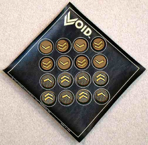 | The 16 cylindrical wood checkers8 blond, 8 darkhave laser-engraved, handpainted arrow images on top. The reverse sides are blank, for those aspects of the games that don't use arrows. The playing board is leather-textured black vinyl, durable, wipes clean easily, rolls up for storage in green felt drawstring pouch. |