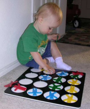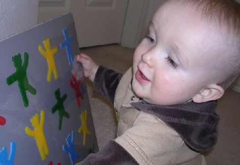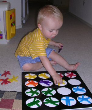 February 2009: At almost two years of age, Daniel has caught on to fitting the bears by shape into their cut-outs, a much more demanding task. And he's got the hang of turning them over when necessary. We're happy his mom keeps a camera close at hand to capture these special learning moments.